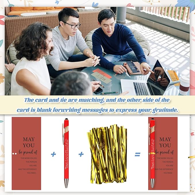 - Package Includes:: You will receice 20 employee appreciation pens in 10 different styles, printed with motivational messages; in addition to the pens, there are also 20 elegant colored employee appreciation cards and 1 bag of gold twist ties, which are convenient for fixing cards and pens